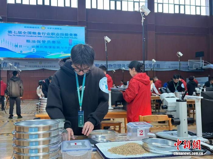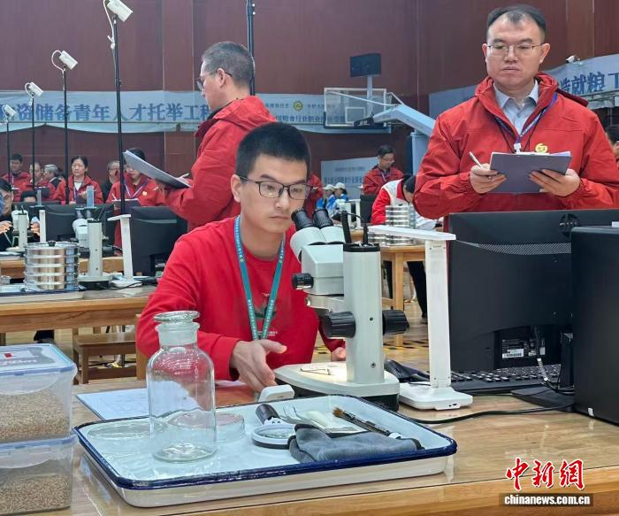 11月4日,第7届齐邦食粮止业事业技巧竞争正在河北郑州落幕。34收代替队的354实选脚盘绕粮油保存员、粮油量量检查员二个工种7个名目停止技巧较量。图为第7届齐邦食粮止业任务技巧角逐现场。王好宁 摄